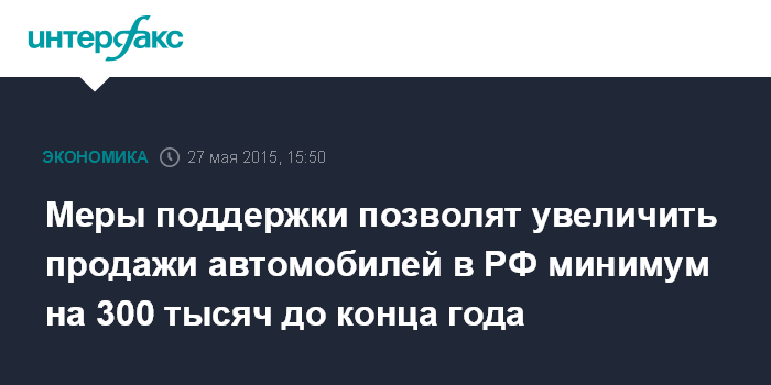 Москва. 27 мая. INTERFAX.RU – Меры поддержки по стимулированию спроса на автомобили позволят увеличить объем продаж в России до конца текущего года не менее чем на 300 тыс. штук, заявил министр промышленности и торговли Денис Мантуров в ходе встречи президента Владимира Путина с членами правительства.