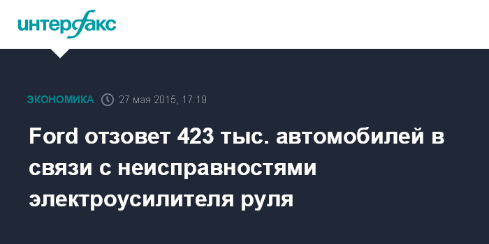 Москва. 27 мая. INTERFAX.RU – Американский автопроизводитель Ford Motor отзывает порядка 423 тыс. автомобилей в Северной Америке в связи с возможными неисправностями электрического усилителя руля, сообщает MarketWatch.