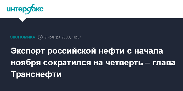 Гавана.9 ноября. INTERFAX.RU - Экспорт российской нефти с начала ноября сокращен примерно на одну четверть, сообщил журналистам глава ОАО "Транснефть" Николай Токарев.