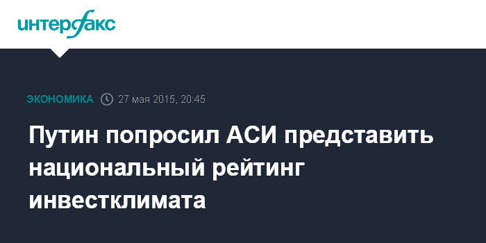 Москва. 27 мая. INTERFAX.RU - Президент РФ Владимир Путин ждет от Агентства стратегических инициатив (АСИ) представления Национального рейтинга состояния инвестиционного климата в стране.