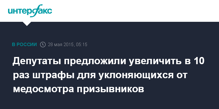 Москва. 28 мая. INTERFAX.RU - Государственный совет Республики Коми намерен в ближайшее время внести в Госдуму законопроект, увеличивающий штрафы для призывников, которые уклоняются от медицинского обследования или затягивают его прохождение. Об этом пишет газета "Известия".
