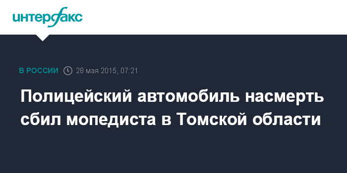 Москва. 28 мая. INTERFAX.RU - В среду вечером на трассе Новомихайловка - Итатка Томской области автомобиль полиции столкнулся с мопедом. Об этом сообщает пресс-служба УМВД по региону в четверг.