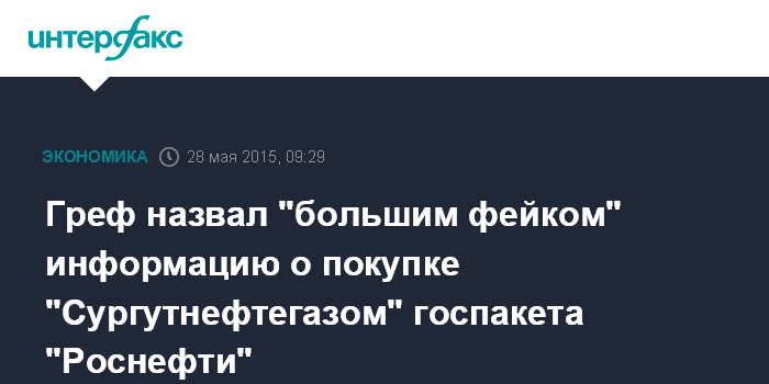 Москва. 28 мая. INTERFAX.RU - Информация о возможной покупке "Сургутнефтегазом", обладающим самой большой среди российских компаний "подушкой ликвидности", госпакета акций "Роснефти" недостоверна, считает глава Сбербанка Герман Греф.