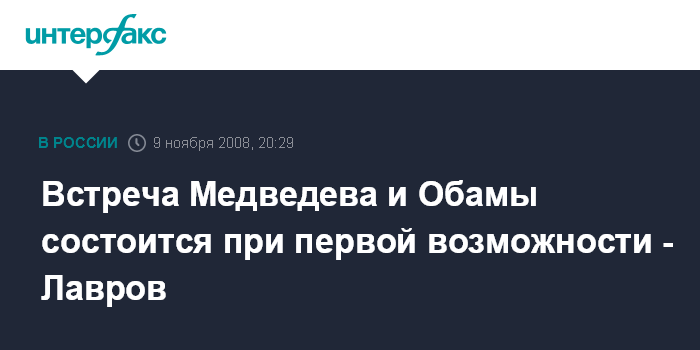 Москва.9 ноября. ИНТЕРФАКС - Президент России Дмитрий Медведев и избранный президент США Барак Обама встретятся при первой же возможности, заявил глава МИД России Сергей Лавров.