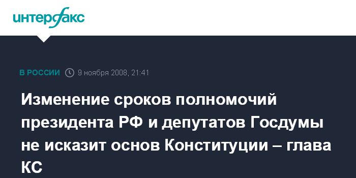 Москва. 9 ноября. ИНТЕРФАКС - Увеличение срока полномочий президента и депутатов Госдумы не изменит основ российской Конституции и не исказит ее, считает председатель Конституционного суда РФ Валерий Зорькин.