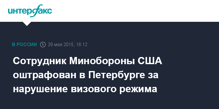 Москва. 28 мая. INTERFAX.RU - Суд Петродворцового района Петербурга ощтрафовал на 5 тыс. рублей гражданского сотрудника министерства обороны США, уличенного в нарушении режима пребывания на территории России.