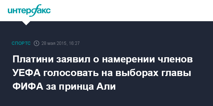 Москва. 28 мая. INTERFAX.RU - Президент Союза европейских футбольных ассоциаций (УЕФА) Мишель Платини заявил о том, что большинство членов союза на предстоящих выборах президента ФИФА отдадут свои голоса не за действующего президента Йозефа Блаттера, а за его соперника, иорданского принца Али бин аль-Хусейна.