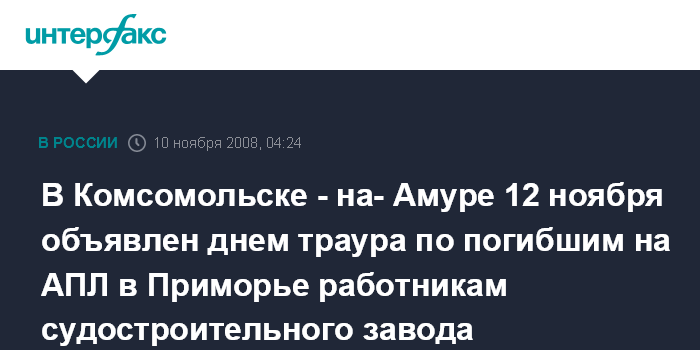 Хабаровск. 10 ноября. ИНТЕРФАКС - ДАЛЬНИЙ ВОСТОК - Администрация города Комсомольска-на-Амуре Хабаровского края приняла решение объявить 12 ноября в городе днем траура по погибшим в результате инцидента на атомной подводной лодке в Японском море работникам Амурского судостроительного завода.