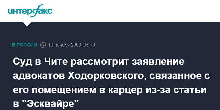 Суд в Чите рассмотрит заявление адвокатов Ходорковского, связанное с его помещением в карцер из-за статьи в "Эсквайре"