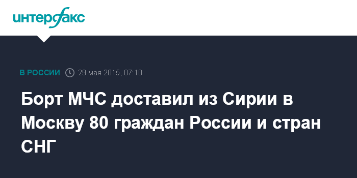 Москва. 29 мая. INTERFAX.RU - Самолет МЧС России Ил-76 доставил из Сирии в Москву 80 граждан РФ и стран СНГ, пожелавших покинуть зону вооруженного конфликта, сообщили в пресс-службе МЧС.