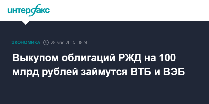 Москва. 29 мая. INTERFAX.RU - ВТБ не будет выкупать все облигации ОАО "Российские железные дороги" на 100 млрд руб., вместо него 40 млрд руб. на бонды ж/д монополии потратит Внешэкономбанк, пишет в пятницу газета "Ведомости".