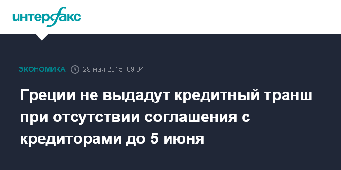 Москва. 29 мая. INTERFAX.RU - Греция не сможет получить кредитный транш, предусмотренный действующей программой помощи, если не достигнет соглашения с кредиторами до конца будущей недели, сообщает агентство Bloomberg со ссылкой на высказывания европейских чиновников.