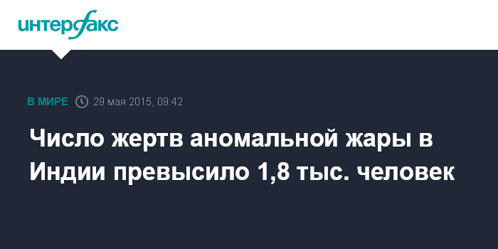 Москва. 29 мая. INTERFAX.RU - Число погибших в результате аномально высоких температур в Индии достигло 1 826 человек, передает в пятницу агентство Associated Press.