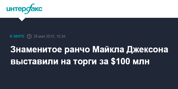 Москва. 29 мая. INTERFAX.RU - Ранчо "Неверленд", принадлежавшее покойному американскому "королю поп-пузыки" Майклу Джексону, выставлено на продажу за $100 млн, сообщает в пятницу американское издание The Wall Street Journal.