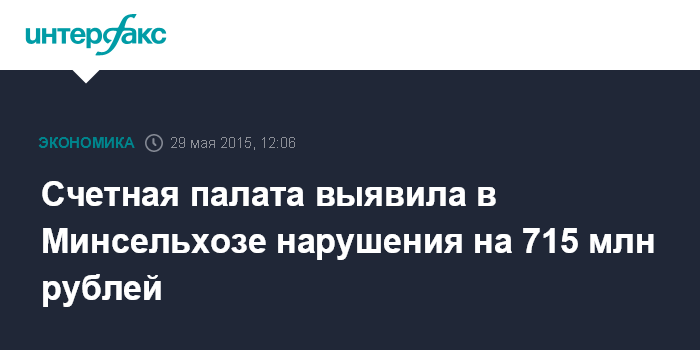 Москва. 29 мая. INTERFAX.RU – Счетная палата по итогам проверки исполнения бюджета за 2014 год выявила в Минсельхозе нарушения на 715,1 млн рублей, сообщается в пресс-релизе контрольного ведомства.