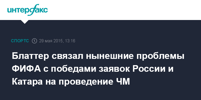 Москва. 29 мая. INTERFAX.RU - Президент ФИФА Зепп Блаттер, выступая перед выборами главы международной федерации на новый срок, связал разразившийся на днях коррупционный скандал с выборами стран - хозяек чемпионатов мира 2018 и 2022 годов.