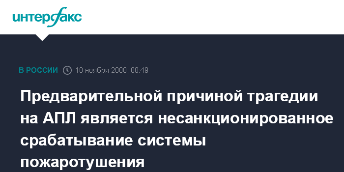 Москва. 10 ноября. INTERFAX.RU - Предварительная версия трагедии, произошедшей 8 ноября в Японском море на атомной подводной лодке, - несанкционированное срабатывание системы пожаротушения. "Такие выводы сделаны на оперативном совещании по расследованию причин трагедии на АПЛ в Большом Камне", - сообщила агентству "Интерфакс -Дальний Восток" пресс-секретарь главного федерального инспектора в Приморье Ксения Гусенцова.
