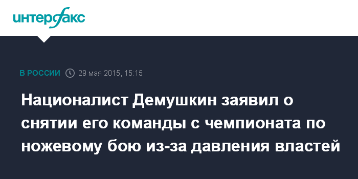 Москва. 29 мая. INTERFAX.RU - Националист Дмитрий Демушкин заявил, что из-за давления на организаторов чемпионата России по ножевому бою всю его команду отстранили от участия в состязаниях.