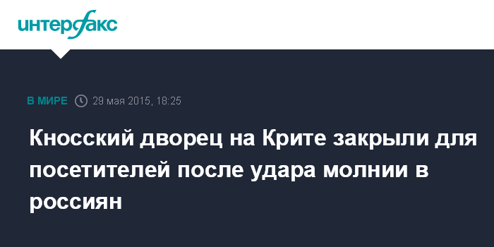 Москва. 29 мая. INTERFAX.RU - Кносский дворец на Крите, где от удара молнии пострадали россияне, закрыт для посещений, на его территории работают военные, сообщают местные СМИ.