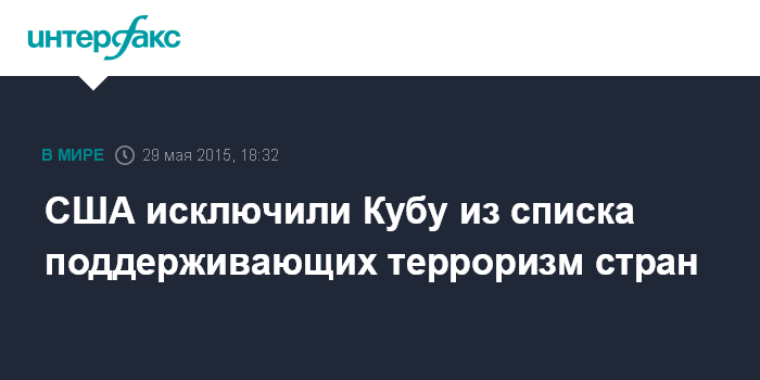 Москва. 29 мая. INTERFAX.RU - Госдеп США в пятницу исключил Кубу из списка стран, поддерживающих терроризм, сообщает агентство Bloomberg.