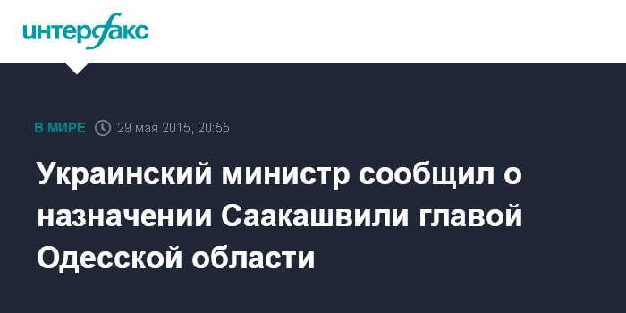 Москва. 29 мая. INTERFAX.RU - Министр экологии и природных ресурсов Украины Игорь Шевченко написал в своем фейсбуке, что экс-президент Грузии Михаил Саакашвили назначен главой Одесской областной государственной администрации.
