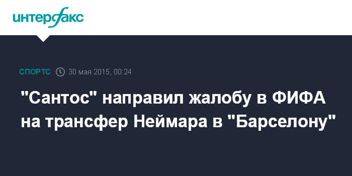Москва. 30 мая. INTERFAX.RU - Бразильский футбольный клуб "Сантос" направил жалобу в ФИФА на 23-летнего нападающего "Барселоны" Неймара, его отца и принадлежащую ему компанию, а также на испанскую "Барселону".