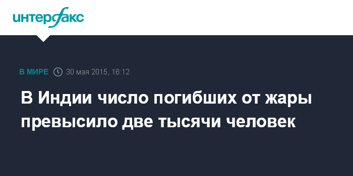 Москва. 30 мая. INTERFAX.RU - Число жертв аномальной жары в Индии составляет 2 015 человек, сообщает в субботу агентство EFE со ссылкой на собственные источники.