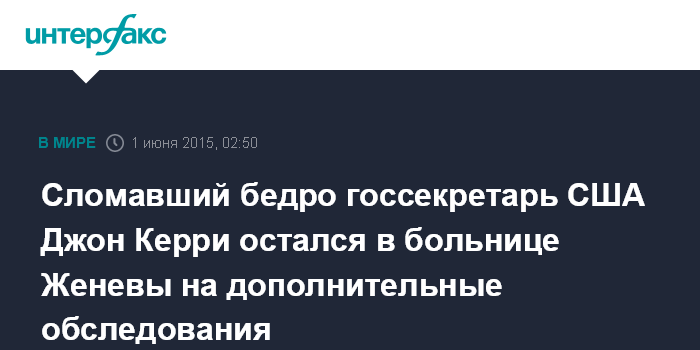 Москва. 1 июня. INTERFAX.RU - Госсекретарь США Джон Керри, сломавший бедро во время велосипедной прогулки в Швейцарии, остался в больнице Женевы. Он вылетит на родину в понедельник, сообщил CNN со ссылкой на пресс-службу госдепартамента.