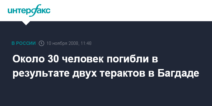 Москва. 10 ноября. INTERFAX.RU - Как минимум 28 человек расстались с жизнью в понедельник в результате двух терактов, совершенных в одном из суннитских кварталов в Багдаде. Еще 68 человек ранены, сообщают местные власти.