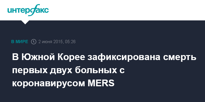 Москва. 2 июня. INTERFAX.RU - В Южной Корее женщина и мужчина, инфицированные смертоносным коронавирусом ближневосточного респираторного синдрома (MERS) скончались, сообщило во вторник министерство здравоохранения РК.