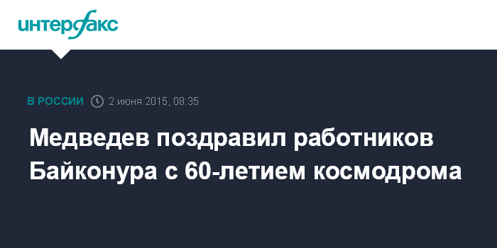Москва. 2 июня. INTERFAX.RU - Премьер-министр РФ Дмитрий Медведев поздравил работников космодрома Байконур с его 60-летием.