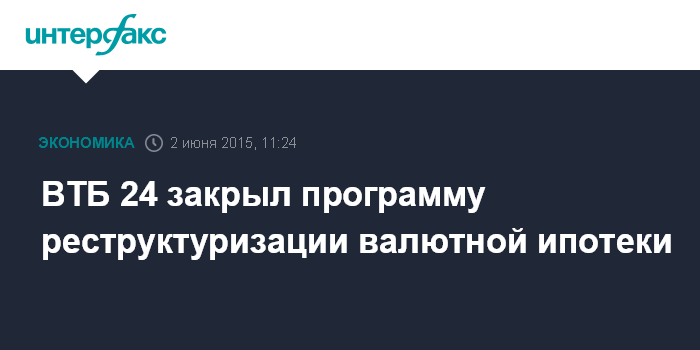 Москва. 2 июня. INTERFAX.RU – Банк ВТБ 24 закрыл программу реструктуризации валютной ипотеки с сохранением валюты кредита и пониженной ставкой, сообщил старший вице-президент, директор департамента ипотечного кредитования ВТБ 24 Андрей Осипов журналистам во вторник.