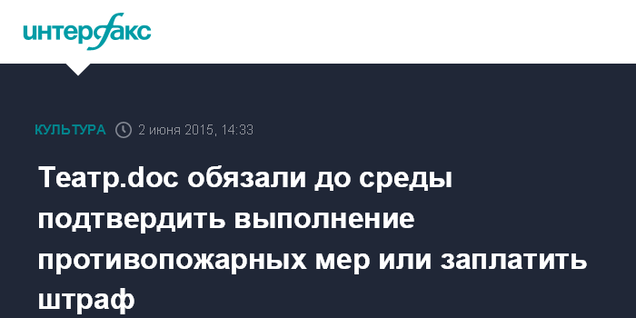 Москва. 2 июня. INTERFAX.RU - Театру.doc обязали до среды документально подтвердить выполнение противопожарных требований или заплатить крупный штраф, сообщила юрист театра Юлия Сычева.