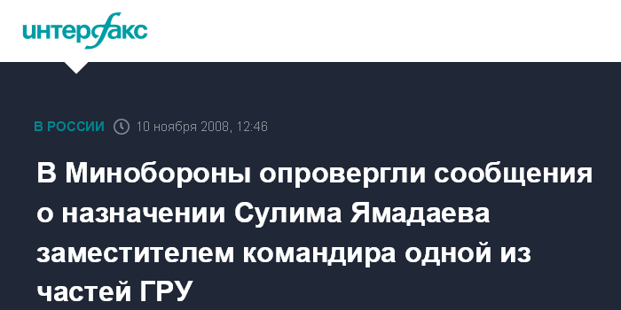 Москва. 10 ноября. INTERFAX.RU - Сообщения о назначении бывшего командующего батальона "Восток" Сулима Ямадаева заместителем командира якобы дислоцирующейся в Таганроге бригады спецназа ГРУ не соответствует действительности, заявил "Интерфаксу-АВН" в понедельник представитель Минобороны РФ.