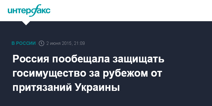 Москва. 2 июня. INTERFAX.RU - Россия будет использовать все юридические возможности в рамках международного права для защиты госимущества, находящегося за рубежом, в случае, если Киев будет добиваться его ареста, заявляют в Кремле.