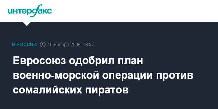Брюссель. 10 ноября. INTERFAX.RU - Министры обороны стран Европейского Союза одобрили в понедельник план проведения военно-морской операции против пиратов у берегов Сомали, сообщает агентство EFE. Речь идет о первой операции такого рода в истории ЕС.