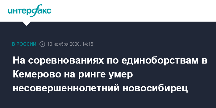 Москва. 10 ноября. INTERFAX.RU - На соревнованиях по кудо (вид рукопашного боя - ИФ) в Кемерово в минувшее воскресенье скончался юниор Артем Коротков из Новосибирска. Как сообщил агентству "Интерфакс-Сибирь" в понедельник главный специалист новосибирского областного управления физкультуры и спорта и куратор по единоборствам Николай Мануйленко, 16-летний новосибирец умер прямо на ринге во время поединка.