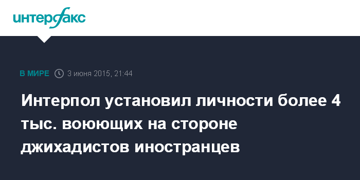 Москва. 3 июня. INTERFAX.RU - Интерполу удалось идентифицировать личности более 4 тыс. иностранцев, присоединившихся к экстремистам в зонах конфликтов, преимущественно в Сирии и Ираке, заявил в среду генсек организации Юрген Шток.