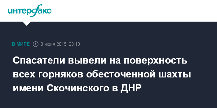 Москва. 3 июня. INTERFAX.RU - Все горняки обесточенной шахты имени Скочинского эвакуированы из-под земли, сообщает пресс-служба МЧС самопровозглашенной Донецкой народной республики.