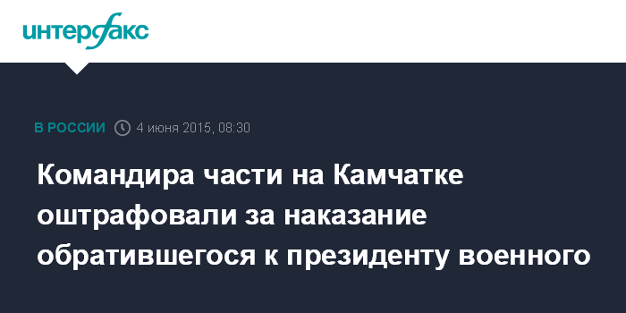 Москва. 4 июня. INTERFAX.RU - Судебные приставы взыскали штраф с командира воинской части на Камчатке, который незаконно наказал подчиненного за обращение к руководству страны, сообщила пресс-служба УФССП по Камчатскому краю в четверг.