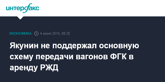 Москва. 4 июня. INTERFAX.RU - Президент ОАО "Российские железные дороги" Владимир Якунин против основной схемы по передаче в аренду монополии парка АО "Федеральная грузовая компания" (ФГК), пишут в четверг "Ведомости" со ссылкой на источники, близкие к РЖД и ФГК.