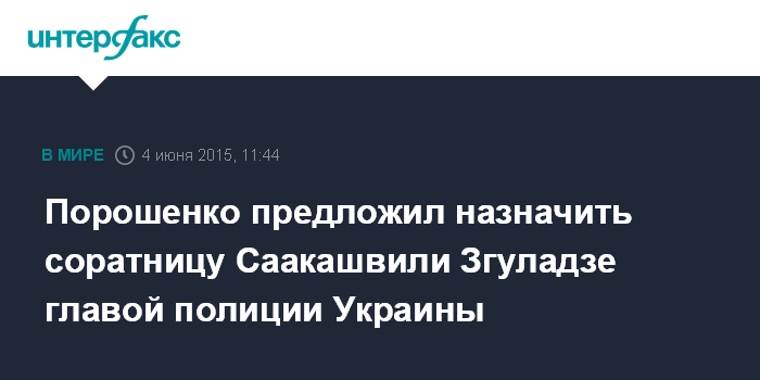 Москва. 4 июня. INTERFAX.RU - Президент Украины Петр Порошенко заявил, что хотел бы видеть руководителем реформированной полиции такого специалиста, как нынешний первый замминистра внутренних дел Украины Эка Згуладзе.