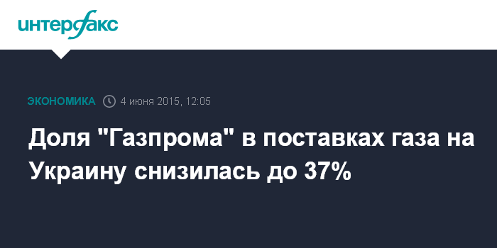 Москва. 4 июня. INTERFAX.RU – Доля "Газпрома" в поставках газа на Украину в первом квартале 2015 года снизилась до 37%, сообщил президент Украины Петр Порошенко.