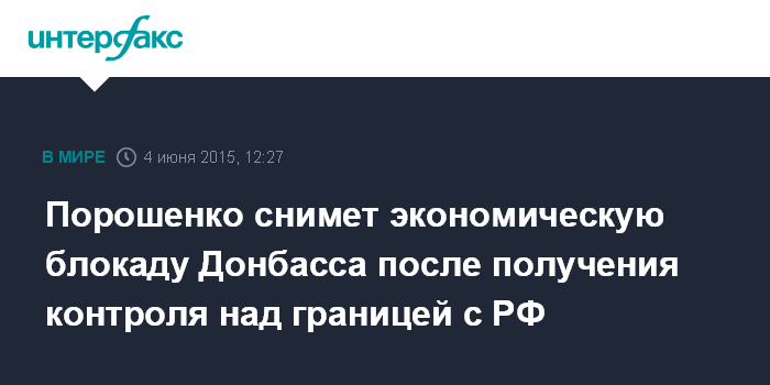Москва. 4 июня. INTERFAX.RU - Президент Украины Петр Порошенко заявляет, что при условии восстановления контроля над российско-украинской границей Киев готов восстановить экономические связи с Донбассом.