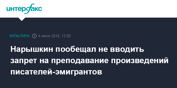 Москва. 4 июня. INTERFAX.RU - Спикер Госдумы Сергей Нарышкин призвал учителей не бояться за писателей-эмигрантов и заверил, что в России никто не будет ограничивать преподавание детям литературы русского зарубежья.
