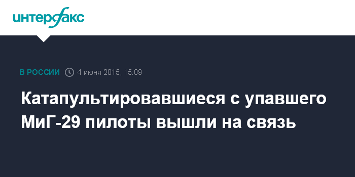 Москва. 4 июня. INTERFAX.RU - Оба пилота с разбившегося в четверг в Астраханской области МиГ-29 вышли на связь с руководителем полетами, сообщили "Интерфаксу" в управлении пресс-службы и информации Минобороны.