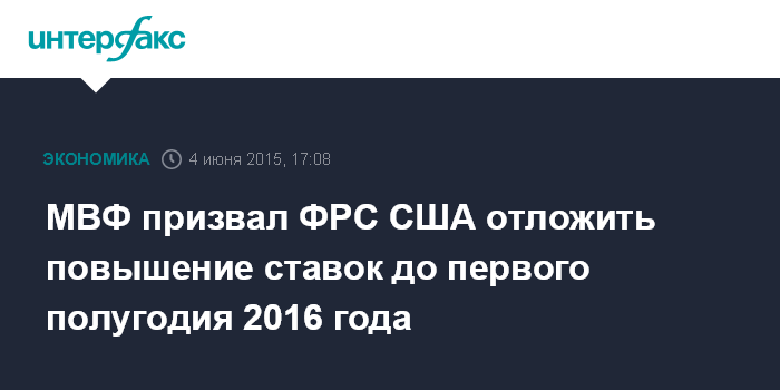 Москва. 4 июня. INTERFAX.RU – Федеральной резервной системе США необходимо отложить повышение процентных ставок до тех пор, пока не появится больше, чем есть в настоящее время, признаков повышения заработной платы или потребительских цен, говорится в ежегодном обзоре американской экономики Международного валютного фонда.