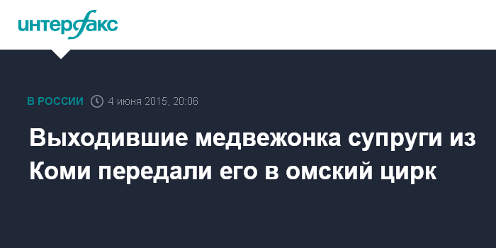 Москва. 4 июня. INTERFAX.RU - Семья из поселка Койгородского района Коми, нашедшая возле дома медвежонка и выходившая его, отдала животное в цирк, сообщили "Интерфаксу" местные жители.