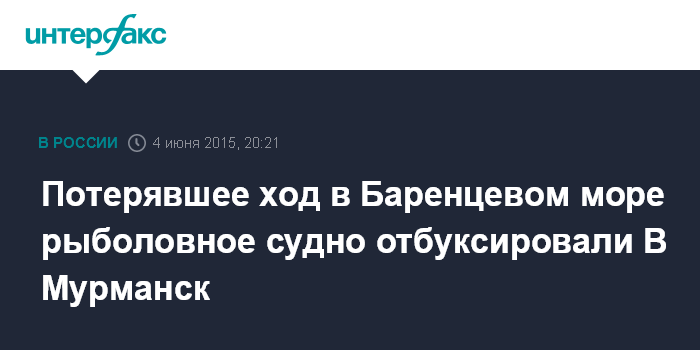 Москва. 4 июня. INTERFAX.RU - Спасательный морской буксир завершил в четверг буксировку в порт Мурманска рыболовного судна М-0480 "Капа", в среду потерявшего ход в Баренцевом море из-за поломки.