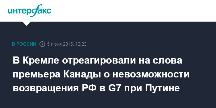 Москва. 5 июня. INTERFAX.RU - Пресс-секретарь президента РФ Дмитрий Песков назвал неконструктивным заявление премьер-министра Канады Стивена Харпера о том, что Россия не сможет вернуться в G7 до тех пор, пока у власти в ней находится Владимир Путин.